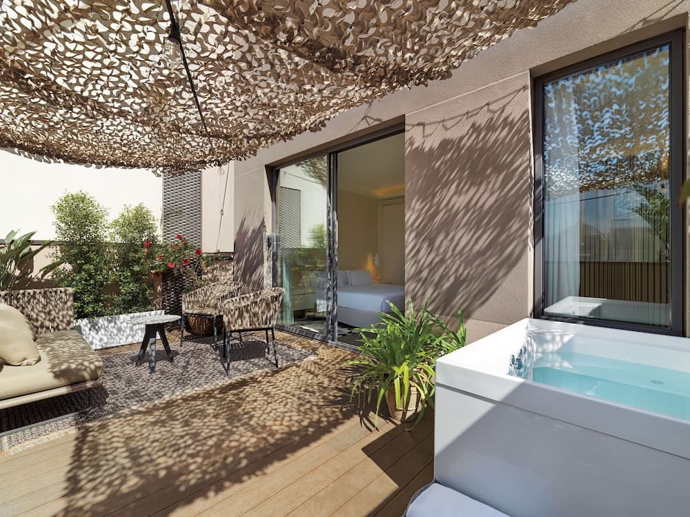 Le must du luxe : une suite avec bain à remous et vue panoramique sur Barcelone.