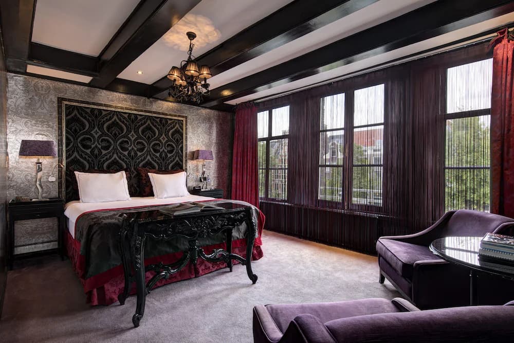 Lit king-size, décoration baroque et vue sur le canal Herengracht.